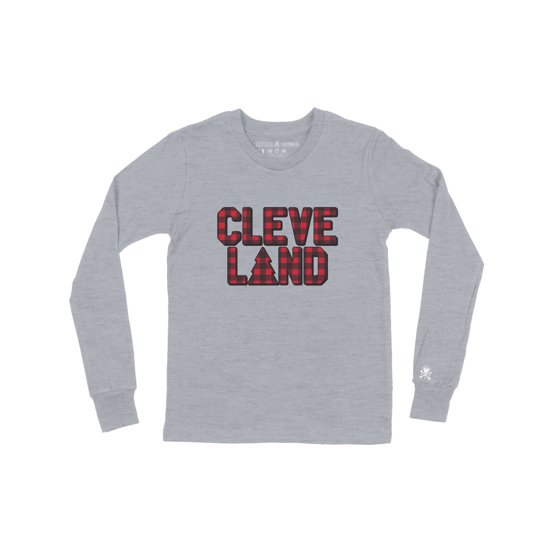Featuring bold red-and-black plaid “CLEVE LAND” lettering with a festive tree design, it’s the perfect blend of cozy cabin vibes and Cleveland spirit. Whether your family’s trimming the tree, visiting Winterfest, or watching the snow fall over The Land, this shirt keeps them warm, comfy, and full of hometown pride.