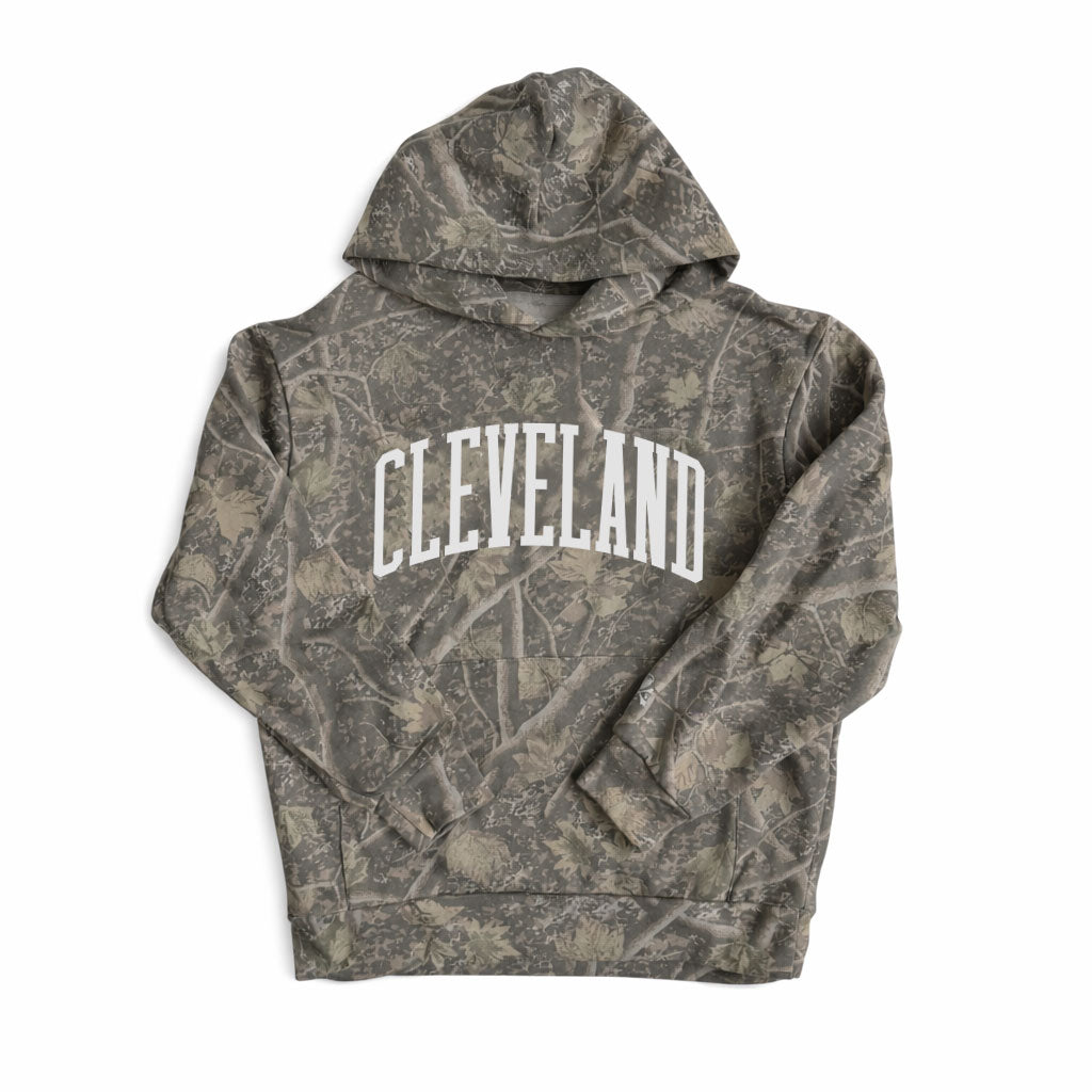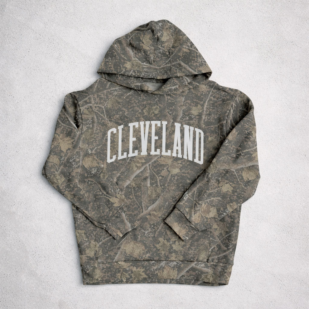 Blend into the wilderness while showing off your city pride with the Cleveland Arch Hoodie in Deadwood Camo. Inspired by Ohio’s rugged outdoor spirit, this hoodie combines a classic collegiate look with a nature-inspired camo pattern that feels right at home from the Metroparks to downtown CLE.